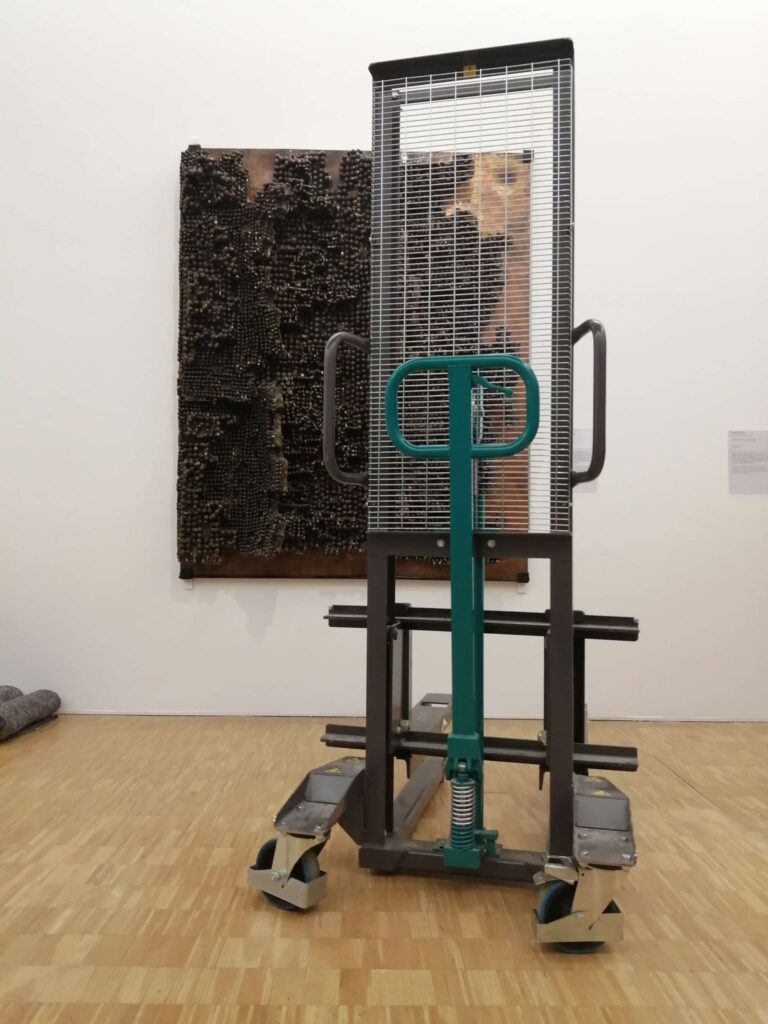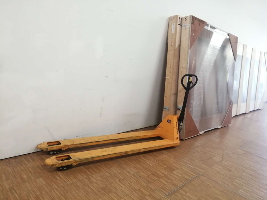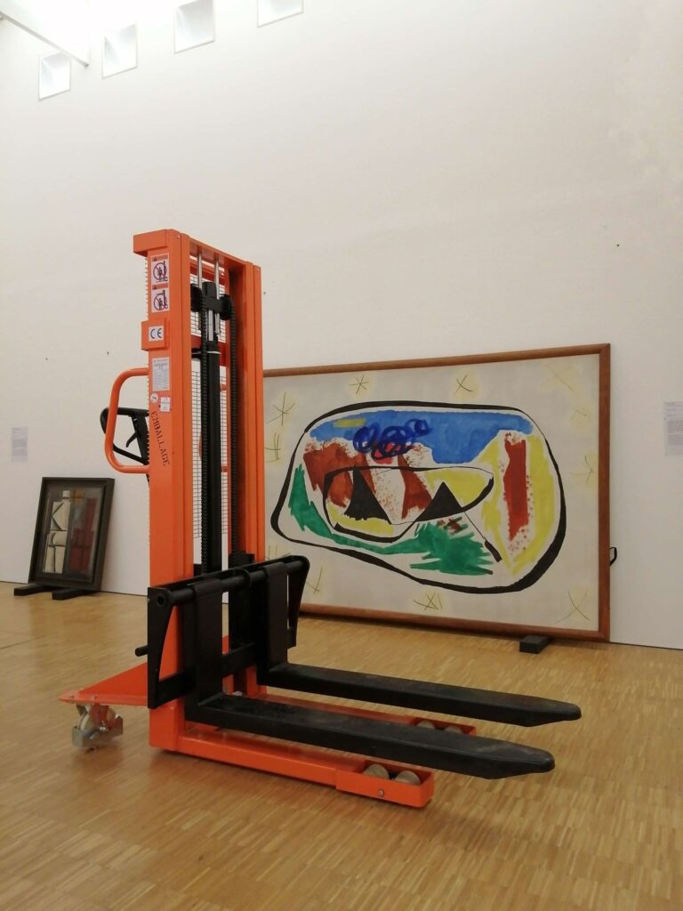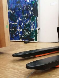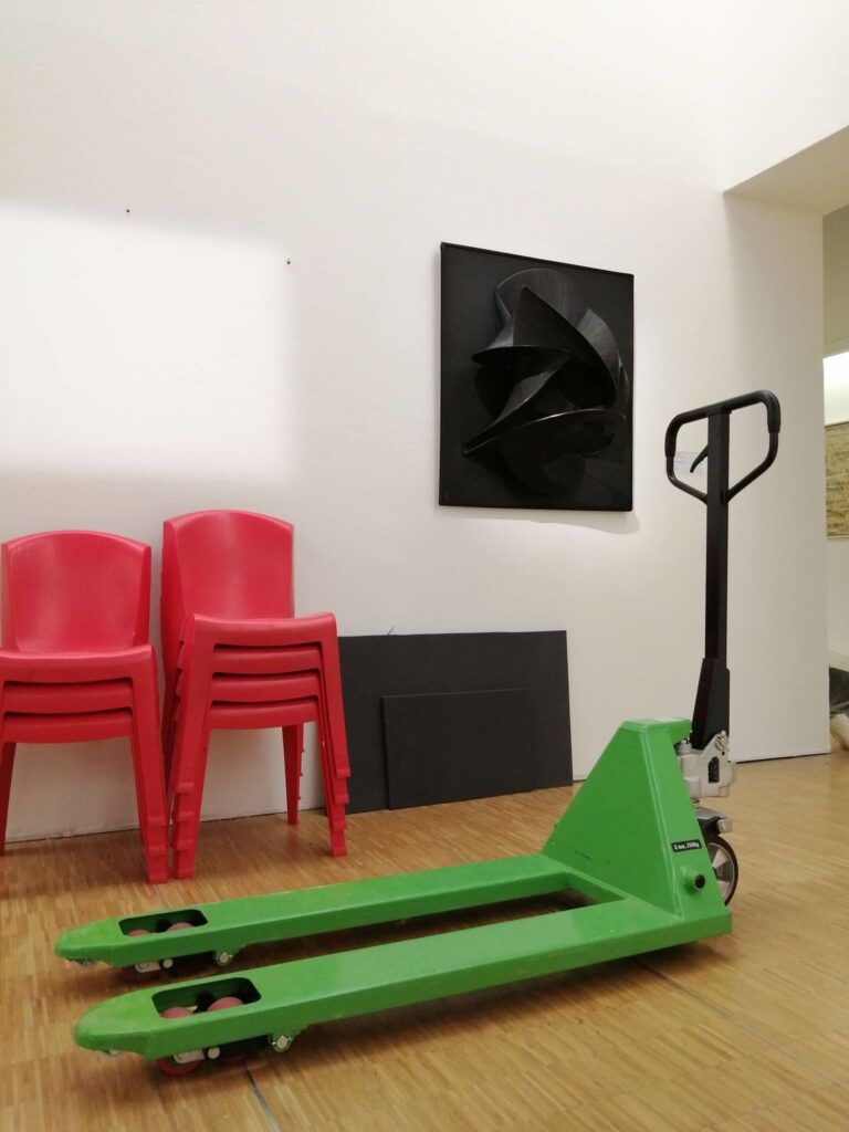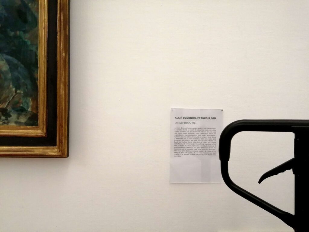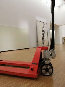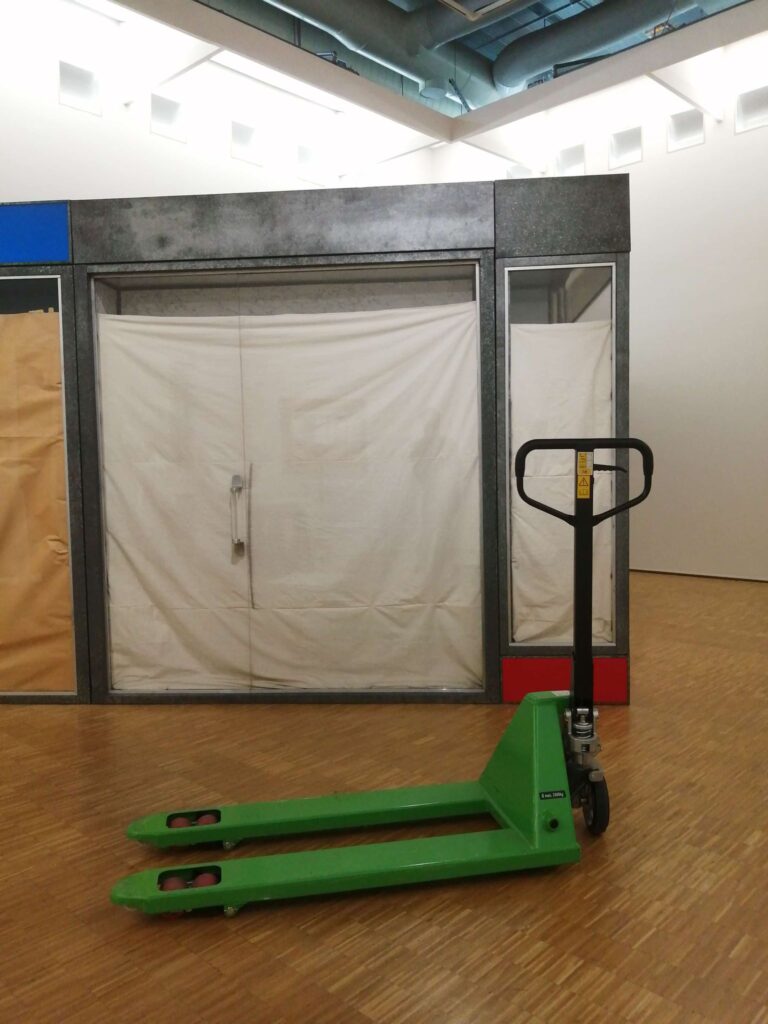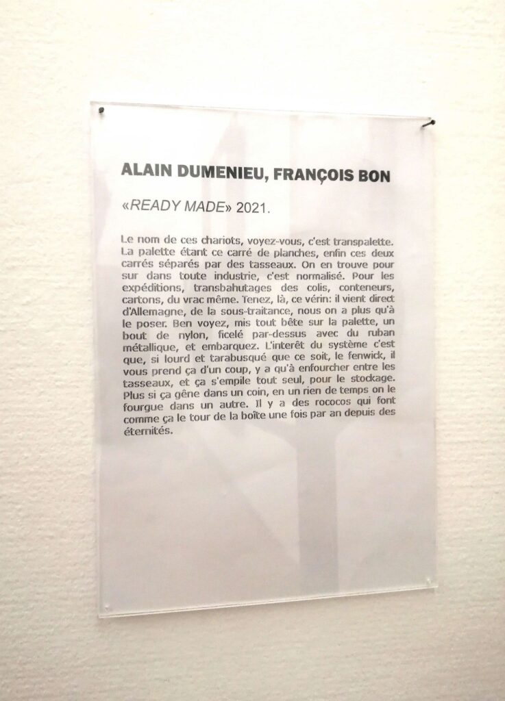 Note de Alain Duménieu: « je dois avouer que depuis l’affaire du transpalette dans la porte de Benjamin Griveaux cet objet me fascine. C’est en trouvant l’apologie de l’objet dans ‘Sortie d’usine », le magnifique livre de François Bon, que j’ai tenté ce happening.
